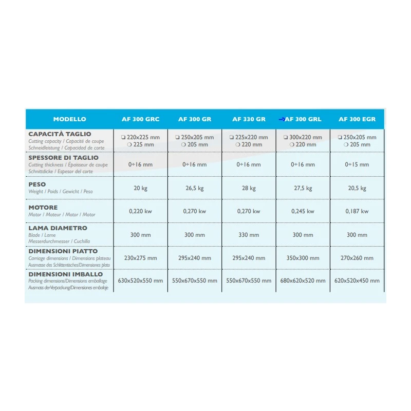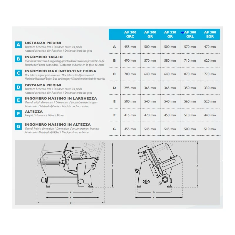 Affettatrice professionale a gravita’ con lama LUNGA 300 mm. Spessore taglio 16 mm. Corsa 270 mm. Progettata per l’installazione nella piccola e media ristorazione.