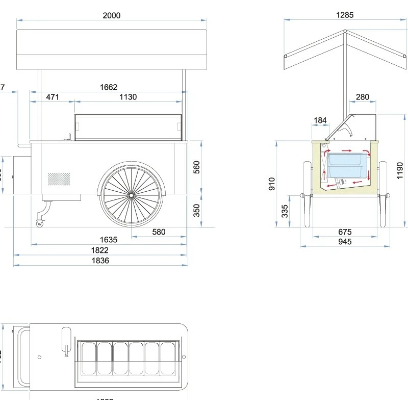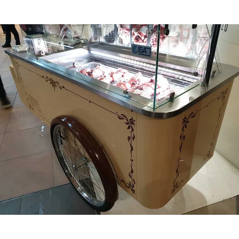 Carrettino per gelati a refrigerazione ventilata con evaporatore alettato e sbrinamento automatico a gas caldo.