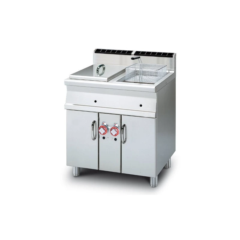Friggitrice con vasca doppia da 13+13 Litri. Produzione patatine 20 Kg/h. Profondità 90 cm.