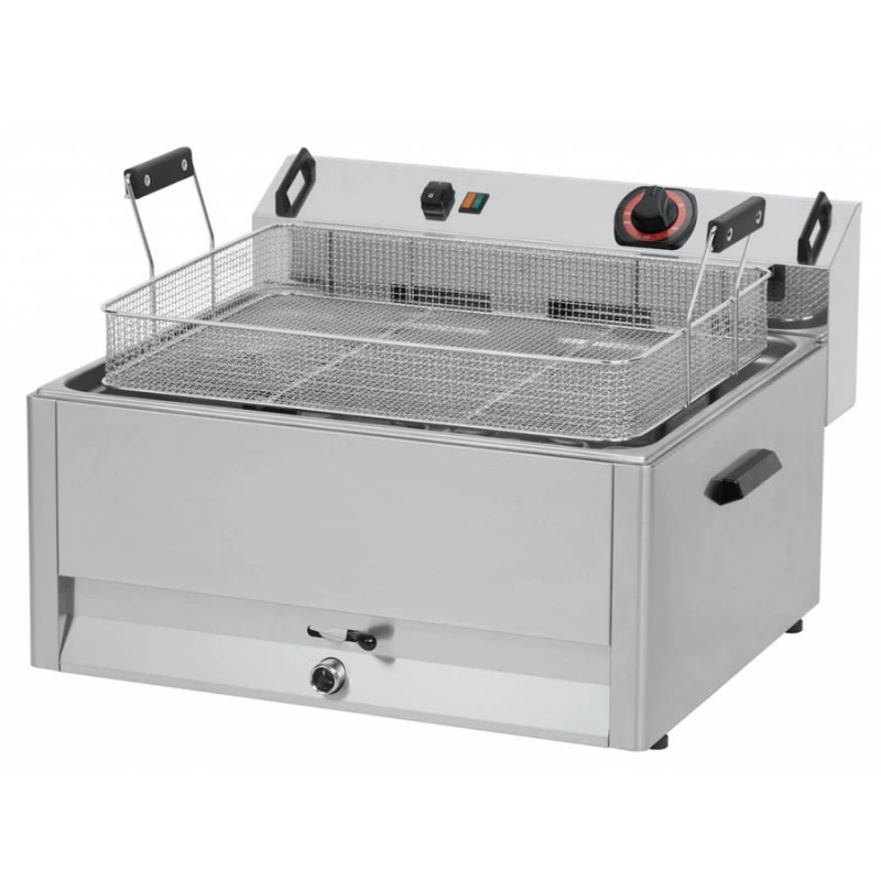 Friggitrice elettrica per pasticceria con rubinetto di scarico e produzione oraria 24Kg/h. Dimensioni: 660x640x415 mm. Dimensioni cestello: 570x440x80 mm