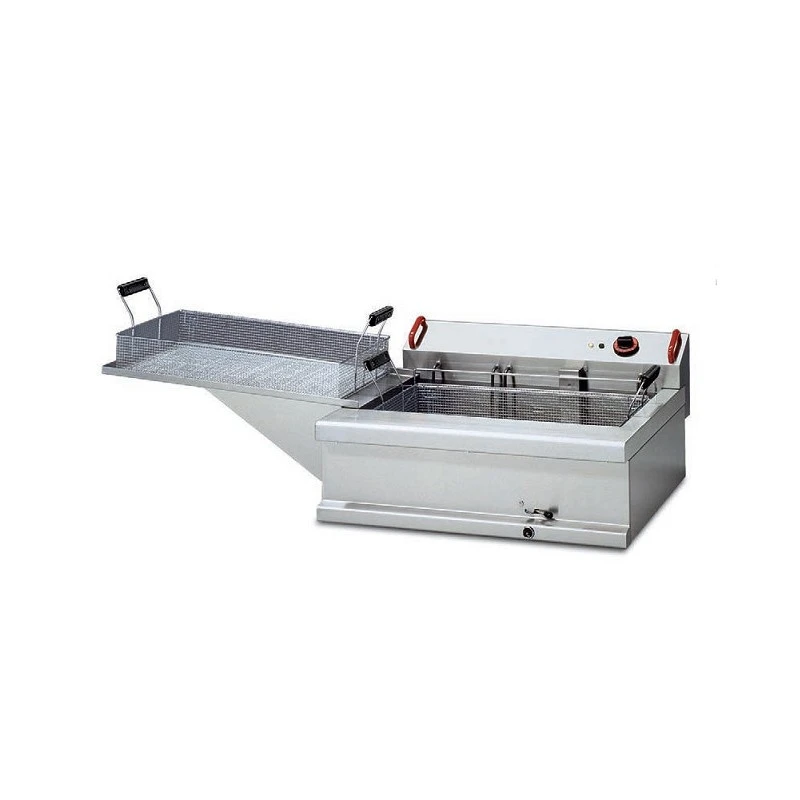 Friggitrice elettrica trifase con filtro e coperchio vasca. Dimensioni 80x70x25h cm. Vasca 70×42,5×17,5h cm. Cesto 67x35x8h cm