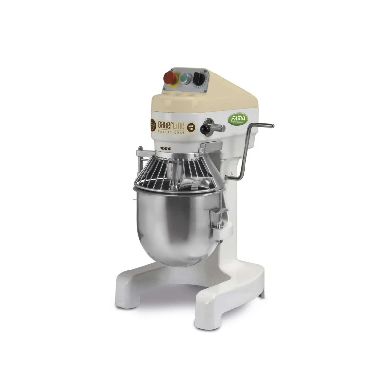 Vasca, protezione grigliata della vasca e frusta in acciaio AISI 304.Spatola e uncino in alluminio A356. Motore asincrono ventilato adatto ad un lavoro pesante e continuativo. Trasmissione a ingranaggi.