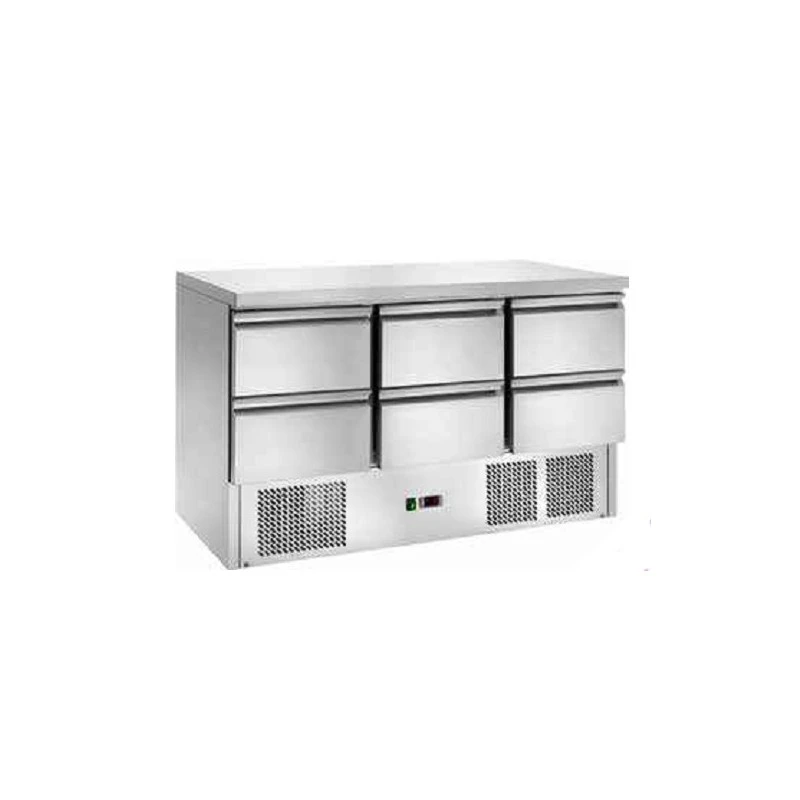 Tavolo frigo con cassettiere interne da 30,0 x 52,5 cm. Dimensioni 1365x700x870h mm. Temperatura +2°C / +8°C. Capacità 300 Litri.