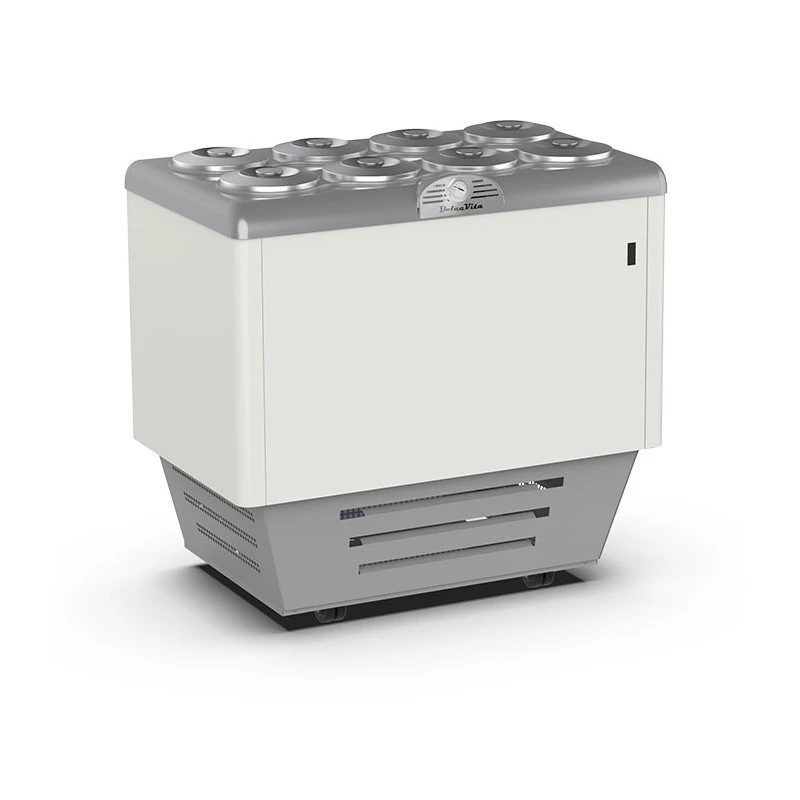 Banco gelato a carapine ideale anche per granite con 8 pozzetti con vano di riserva per 8 gusti. Modello dolcevita