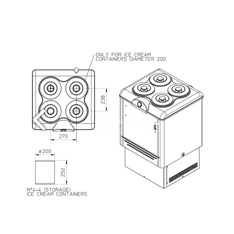 Banco gelato a carapine ideale anche per granite con 4 pozzetti con vano di riserva per 4 gusti. Modello dolcevita in acciaio AISI 304 con effetto metallescente