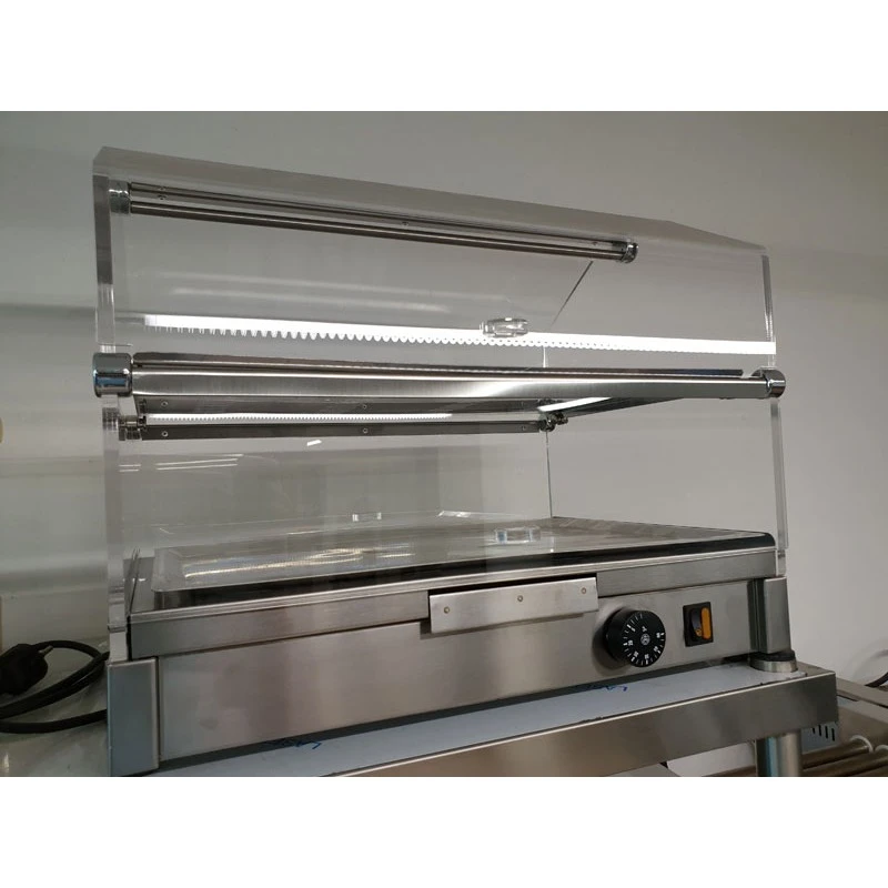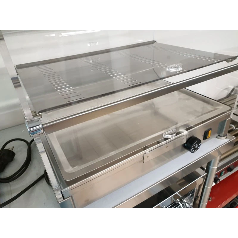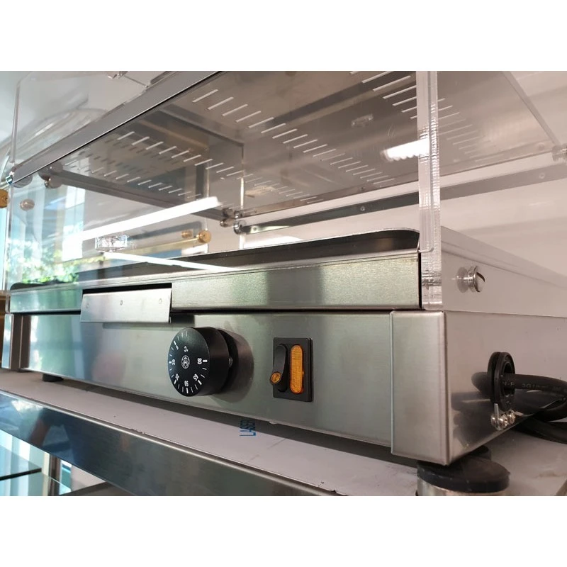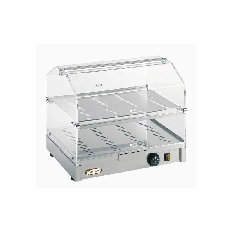 Vetrina riscaldata con due piani e antine sagomate in metacrilato trasparente.