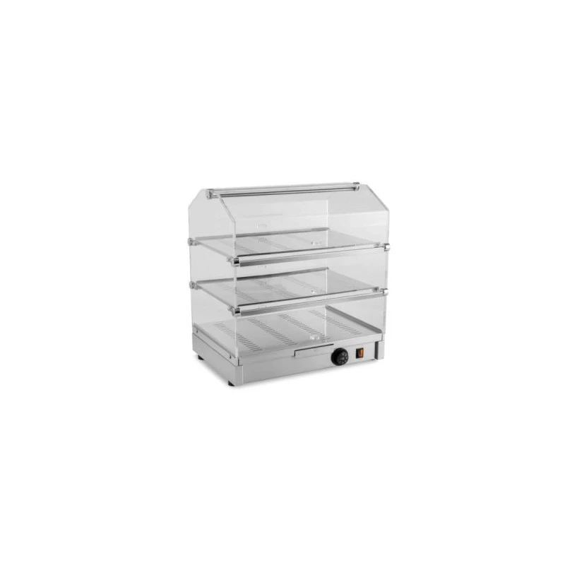 Vetrina riscaldata con due piani e antine sagomate in metacrilato trasparente.
